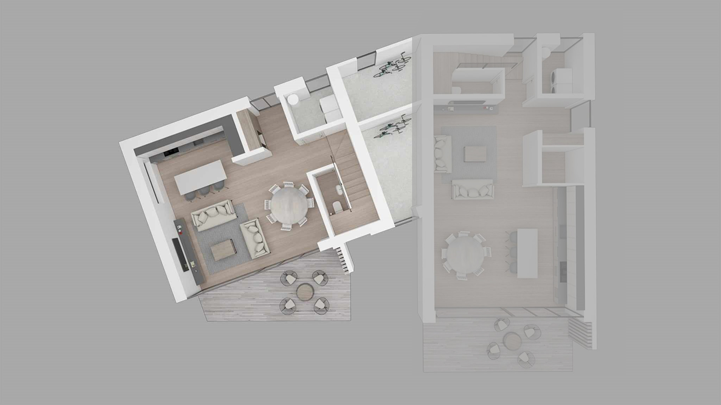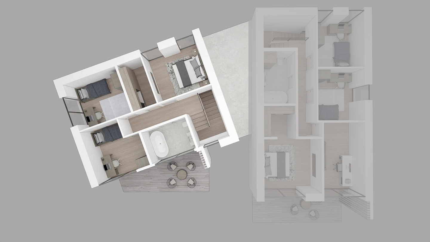 Namas Nr. 1 turi 100 kv. m gyvenamojo ploto, o Namas Nr. 2 – 132 kv m. gyvenamojo ploto.